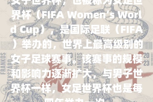 女子世界杯,也被称为女足世界杯(FIFA Women’s World Cup),是国际足联(FIFA)举办的,世界上最高级别的女子足球赛事。该赛事的规模和影响力逐渐扩大,与男子世界杯一样,女足世界杯也是每四年举办一次。