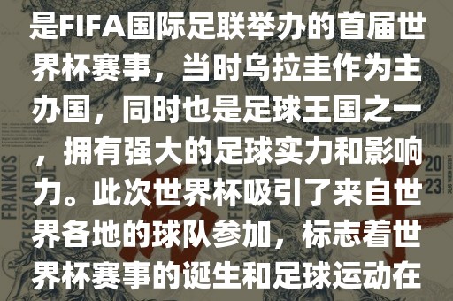 1930年乌拉圭世界杯是足球历史上的一次重要事件,标志着世界杯赛事的诞生和足球运动在全球范围内的普及和发展。
