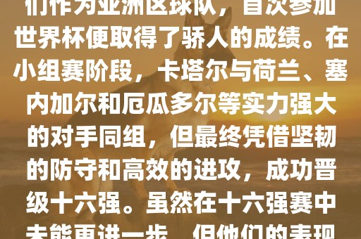 关于卡塔尔在2022年世界杯的表现,可以说是非常出色的。他们作为亚洲区球队,首次参加世界杯便取得了骄人的成绩。在小组赛阶段,卡塔尔与荷兰、塞内加尔和厄瓜多尔等实力强大的对手同组,但最终凭借坚韧的防守和高效的进攻,成功晋级十六强。虽然在十六强赛中未能更进一步,但他们的表现已经赢得了球迷和对手的尊重。