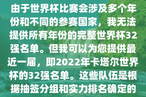 摘要:本文无法提供所有年份的世界杯32强名单,但可以为您提供2022年卡塔尔世界杯的32强名单。这些队伍是通过抽签分组和实力排名确定的。世界杯比赛涉及多个年份和不同的参赛国家,因此无法提供完整的名单。
