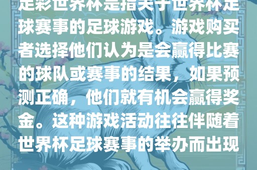 摘要:足彩世界杯是一种基于世界杯足球赛事的足球游戏,玩家通过预测比赛结果来参与游戏,有机会赢得奖金。这种游戏活动通常伴随着世界杯足球赛事的举办而出现,玩家可以选择他们认为会获胜的球队或赛事结果。